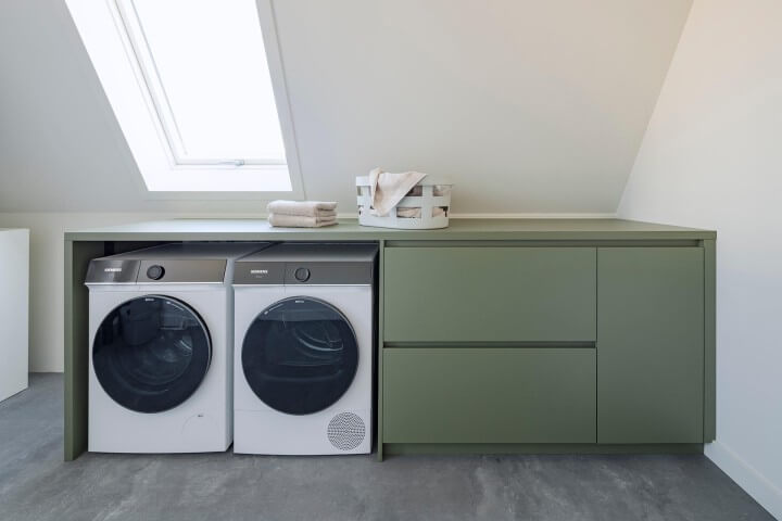 Tall laundry cabinet combined with a low cabinet with worktop, or low unit for appliances with a ceiling-high storage cabinet -