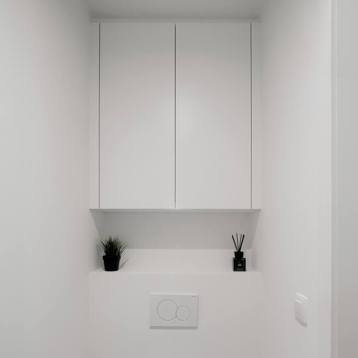 A sleek combination of a low cabinet and a ceiling-high cabinet in one seamless wall setup -